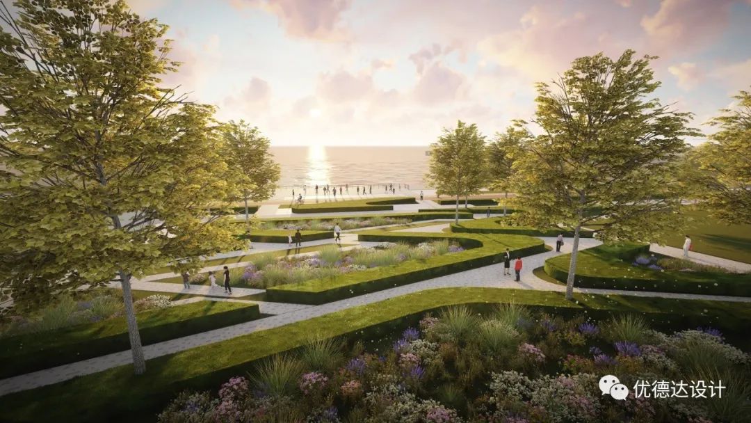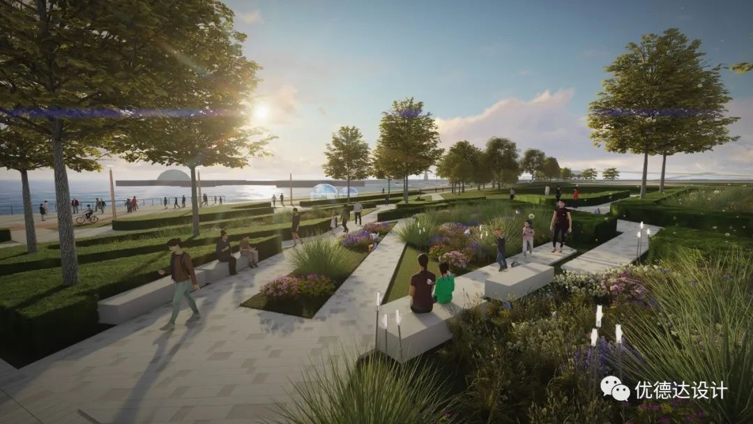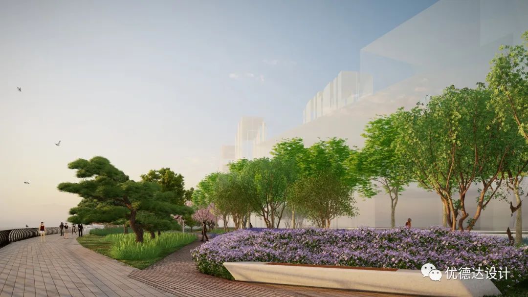 The waterfront public space will feature the "Eight Scenic Gardens," resembling a string of emerald necklaces along the eastern shore of Jiaozhou Bay. The area will be transformed into:
