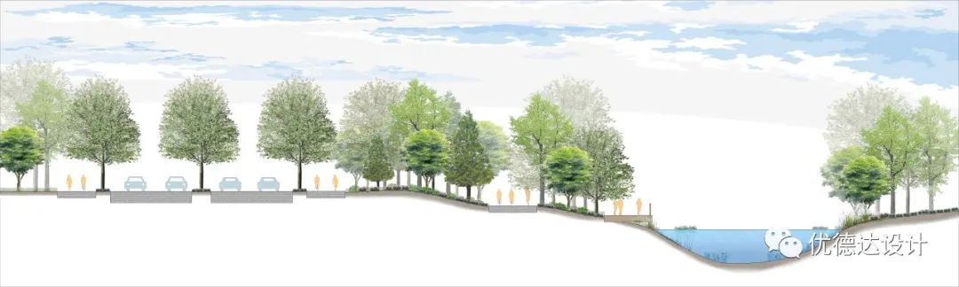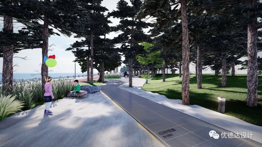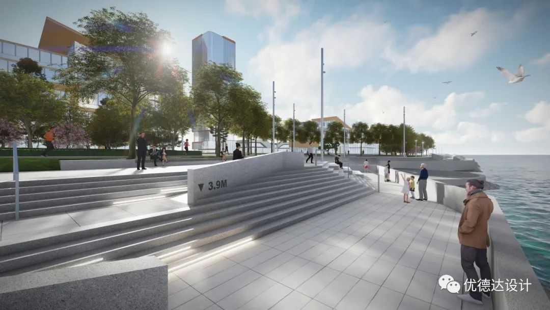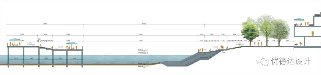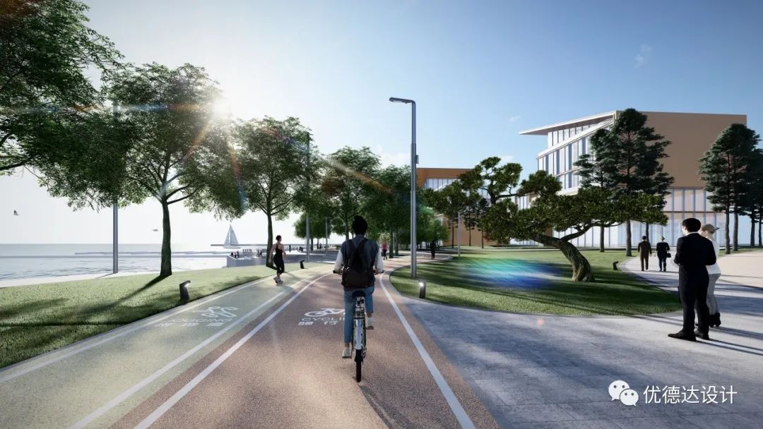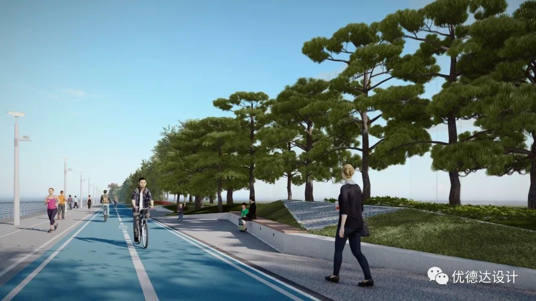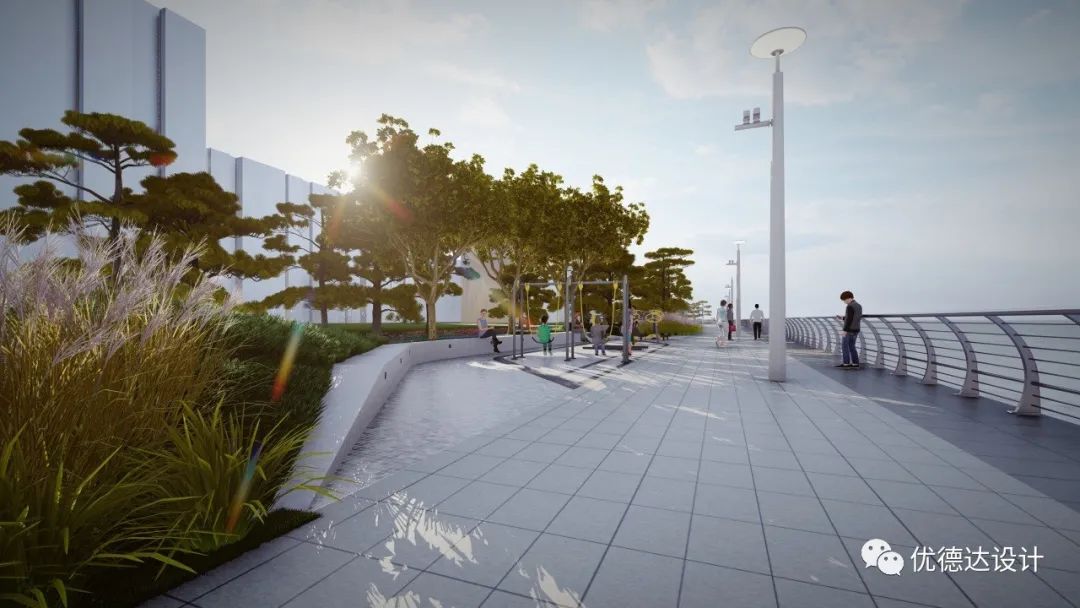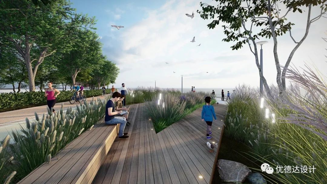 The coastal zone and Haibo River adopt artificial revetments to connect urban and water elements, meeting citizens' desire for waterfront interaction and fostering dialogue between people and space.