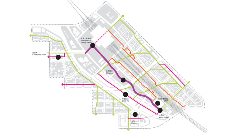 This project involves the comprehensive redevelopment of the area surrounding Taiyuan South Railway Station. Located 10 kilometers from the city center, the site is distinctly defined by two major transportation infrastructures - the railway and expressway systems - which naturally divide the area into three clearly demarcated zones.
