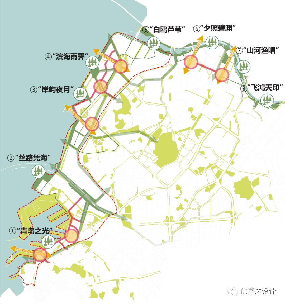The "Eight Scenic Parks" design philosophy is rooted in an interpretation of Qingdao’s natural geography and modern history. Proposing "Eight Great Parks in the North, Mirroring the Eight Great Passes in the South," the vision transforms the waterfront into a linked emerald necklace along Jiaozhou Bay’s eastern shore. This system fosters local pride while creating an interconnected, accessible, multi-level, and diverse open-space network, significantly elevating the city’s quality of life.