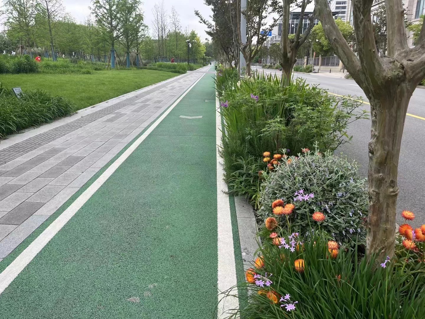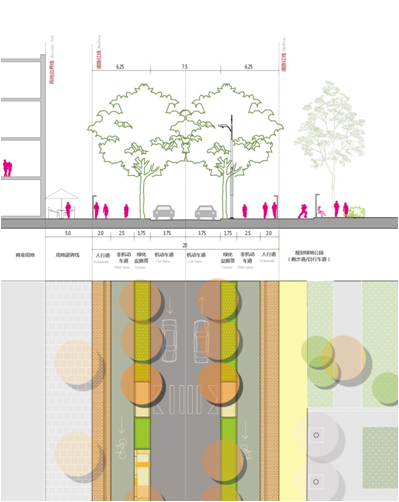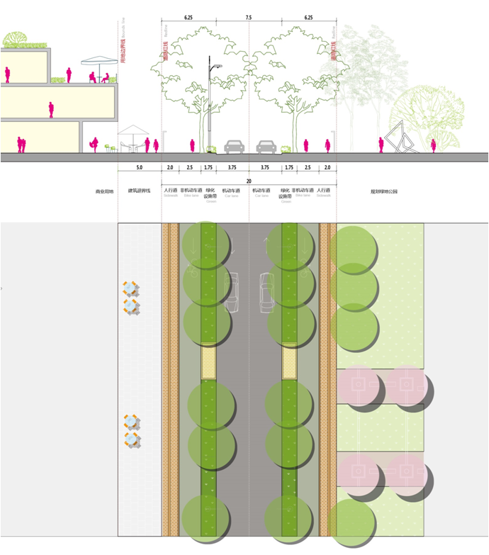 Through inviting pedestrian pathways, cycling routes, and thoughtfully curated streetscapes, the design elevates the environmental quality of the street network. Beyond basic transit functions, these spaces now offer leisure, social engagement, and smart technology interactions, creating a vibrant, ecologically conscious, and culturally rich model district for urban landscape innovation.