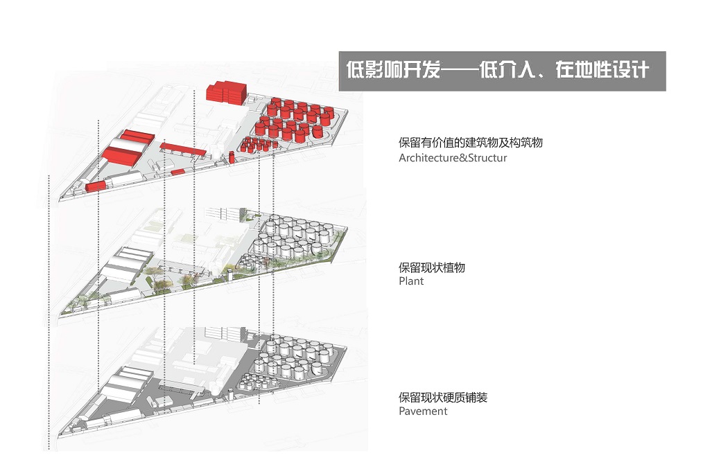 The existing warehouse is repurposed into a cultural and creative building and an artistic flower garden, while the fueling canopy is transformed into an art and leisure corridor. Retaining walls are converted into artistic performance platforms, and ground paving incorporates pipeline-inspired designs.